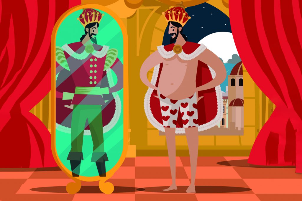 Iedereen kent het beroemde verhaal van de ijdele koning die dag en nacht bezig is om zichzelf te verkleden. Hij lijkt net rupsje nooit genoeg, want hij is nooit tevreden. Steeds verlangt hij naar nog meer, andere, nieuwere en bijzondere kleren. Tot er twee slimmeriken hem eens helemaal op de hak nemen met hun verhalen over een geheimzinnige stof waarmee hij ook zelfs kan testen of mensen slim of dom zijn.